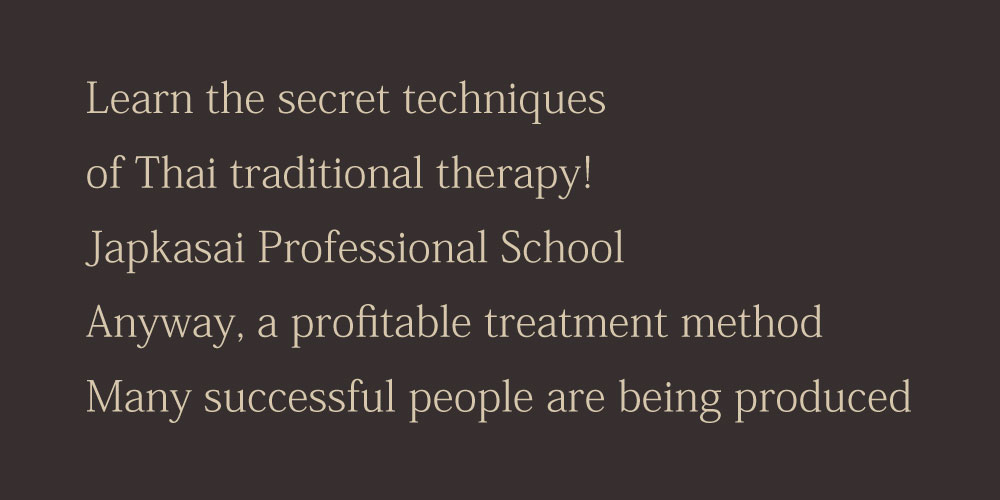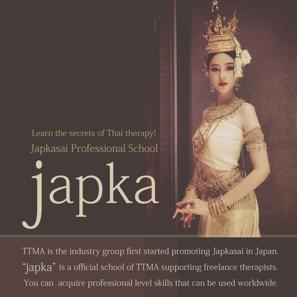 There is a complete shortage of Japkasai therapists. Many people want to receive authentic Japkasai, a traditional Thai medicine, but they all say, "There are many erotic Japkasai, but I don't know which ones are doing it as real traditional medicine..." At TTMA, we are working to promote healthy "Japkasai" by introducing healthy salons, introducing therapists with proper skills, and introducing schools where you can learn properly, but we believe that the most important thing to do is to increase the number of people who can do authentic Japkasai and increase the number of actual stores. In Japan, there are some stores that are serious about authentic Japkasai, but it is also true that there are some stores that incorporate it as part of their rejuvenation massage service, and that careless treatments such as simply pulling without taking traditional medicine theory into account are rampant. Because of this, Japkasai is sometimes misunderstood as a shady treatment like a prostitution, but that is why the real thing is in demand. By providing the real thing, you will surely be able to increase your profits. Thai traditional massage is now being recognized correctly, but around 2000, most people thought, "Thai traditional massage is prostitution, right?" I feel that the situation is exactly the same for Japkasai. I hope you understand that it is now, when there are misunderstandings, that it is easy to make a business out of it. TTMA believes that it can contribute to your business through authentic treatments that are as close to medical treatment as possible.